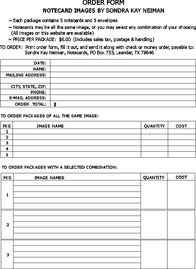 envelopes included. Price per package of five is $6, which includes sales tax, postage, and handling. You may order your package(s) with all the same image, or you can mix and match five different images of your choice. You may order one of three ways: 1) email me at sondra@pixielake.com, Subject line: Notecards. Give me your name, email address, and mailing address. Tell me what you'd like, and I'll email you back to confirm the order. As soon as I receive your check or money order, I'll mail your notecards! 2) Print out the Order Form, fill it out completely, and send it, along with your check or money order to: PO Box 753 Leander, TX 78646 Upoon receiving your order, I will email you to let you know it has been received, then I should have your order prepared and mailed within a week! (3) Order online through PayPal. THANK YOU! |